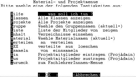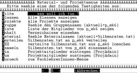 Danach schließe ich diesen Vorgang mit der Enter-Taste ab. Nachdem nun die Projektgruppe und das Material eingetragen sind, kann ich an die Materialverteilung gehen. Dazu wähle ich Verteilen- aus und drücke die Enter-Taste. Jetzt müsste mein Material in dem homes-Laufwerk H: jedes einzelnen Projektgruppenmitgliedes gelandet sein. Mit der Option XXX/verteilte Silbenraten.txt aus p_ek6 loeschen kann ich verteilte Dokumente auch wieder bei allen Projektmitgliedern löschen.